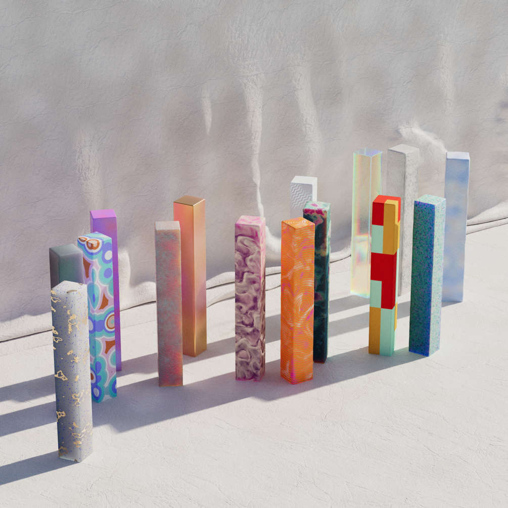 The pack features various types of surface displacements, subsurface scattering, noise patterns, and colors; all available for you to tweak and play with in the attributes panel, once you select a material.